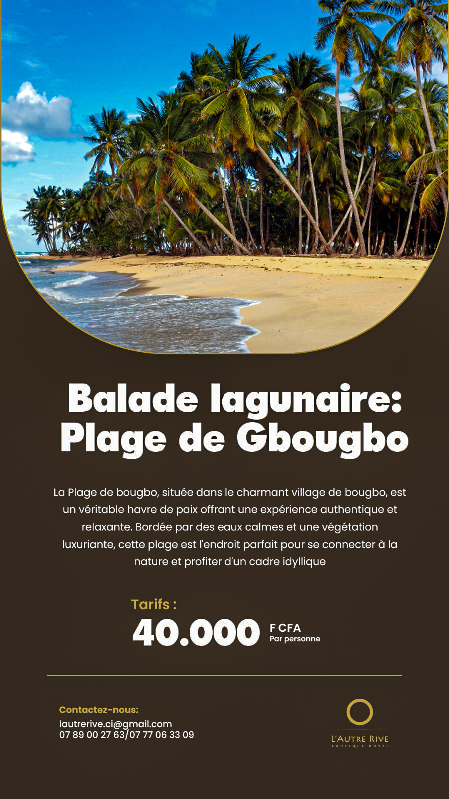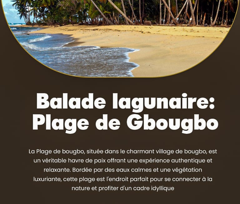 La Plage de bougbo, située dans le charmant village de bougbo, est un véritable havre de paix offrant une expérience authentique et relaxante. Bordée par des eaux calmes et une végétation luxuriante, cette plage est l'endroit parfait pour se connecter à la nature et profiter d'un cadre idyllique.